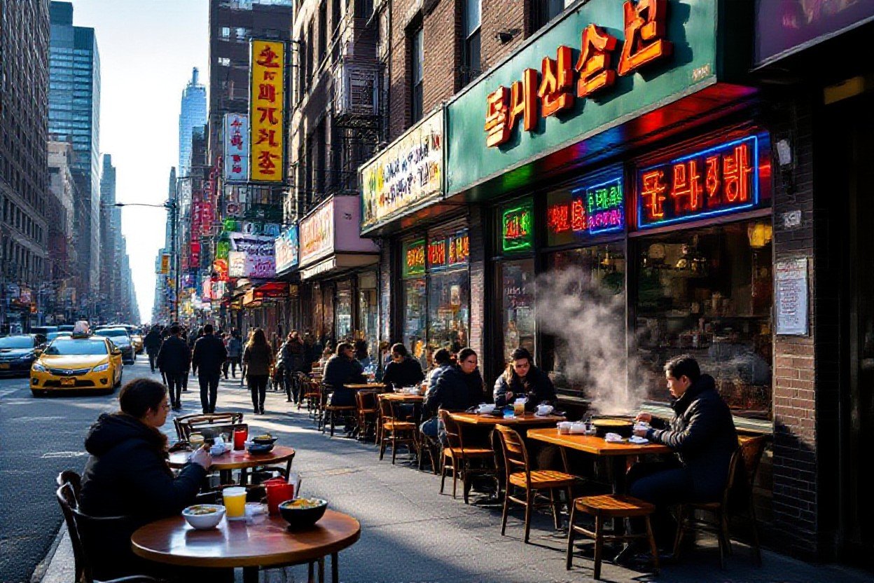 On West 32nd Street you find concrete examples of that cultural layering: longtime restaurants like late-night barbecue spots and tofu houses share blocks with bakeries, PC bangs and karaoke rooms, while storefront signs in Hangul stand alongside English menus. I shoot both the busy evenings-steam rising from soondubu jjigae bowls-and quiet mornings when owners sweep sidewalks; you learn to frame both spectacle and small gestures. Those scenes taught me to look for continuity in details: a church bulletin board, a handwritten flyer for a Lunar New Year event, a storefront photographer’s portrait-each becomes a visual clue that helps you understand how a neighborhood holds memory and reinvention at once.